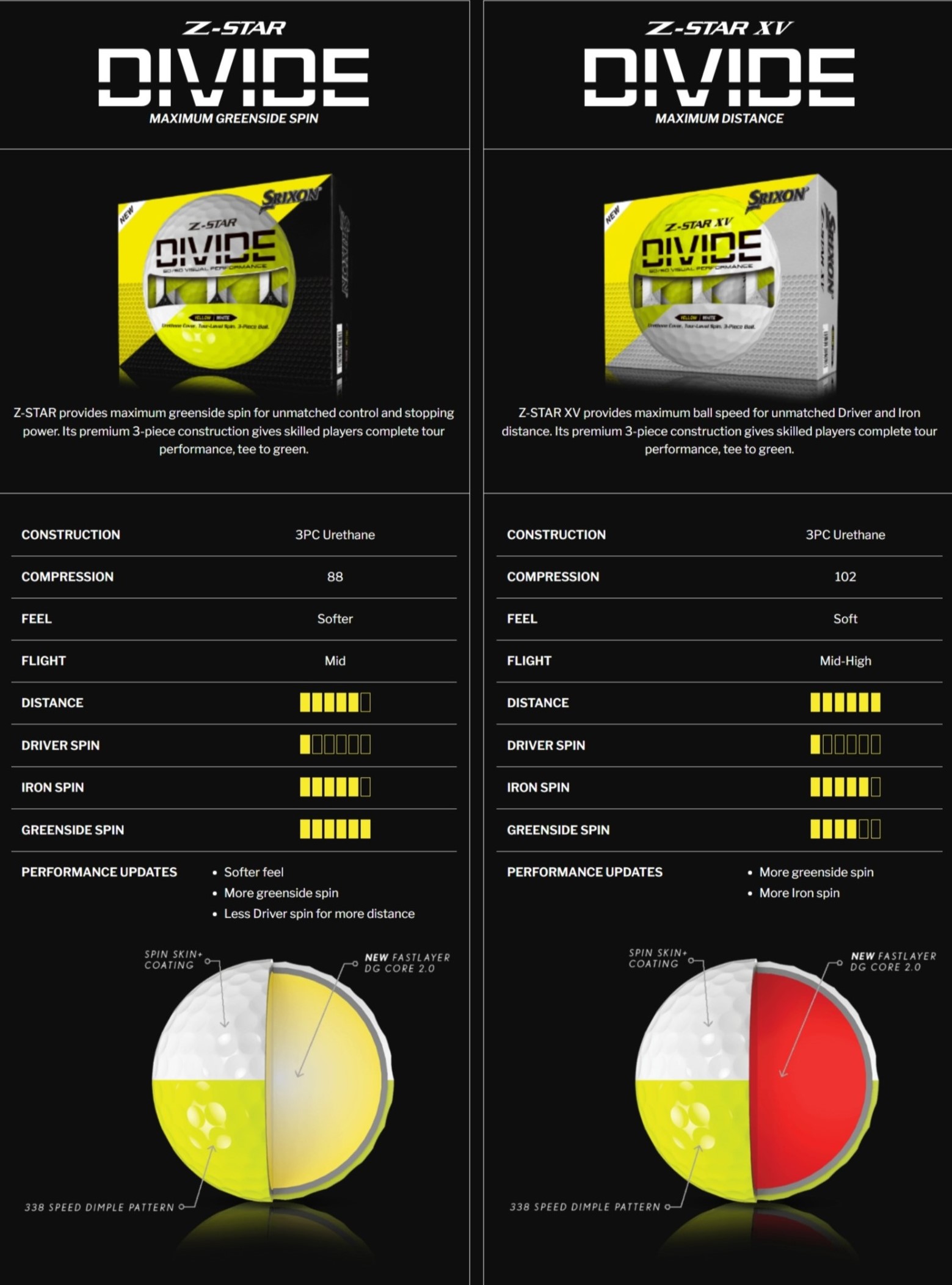Z-STAR DIVIDE provides maximum greenside spin for unmatched control and stopping power. Its premium 3-piece construction gives skilled players complete tour performance, tee to green.